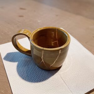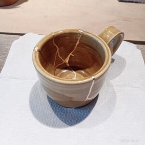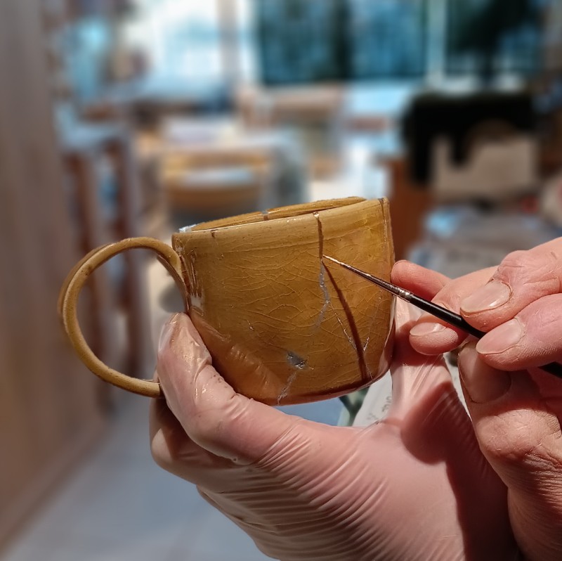 修理完了の器は接着され漏れなどはありませんが、割れ跡は金色に彩られます。また修理後の器は電子レンジでの使用が不可となります。